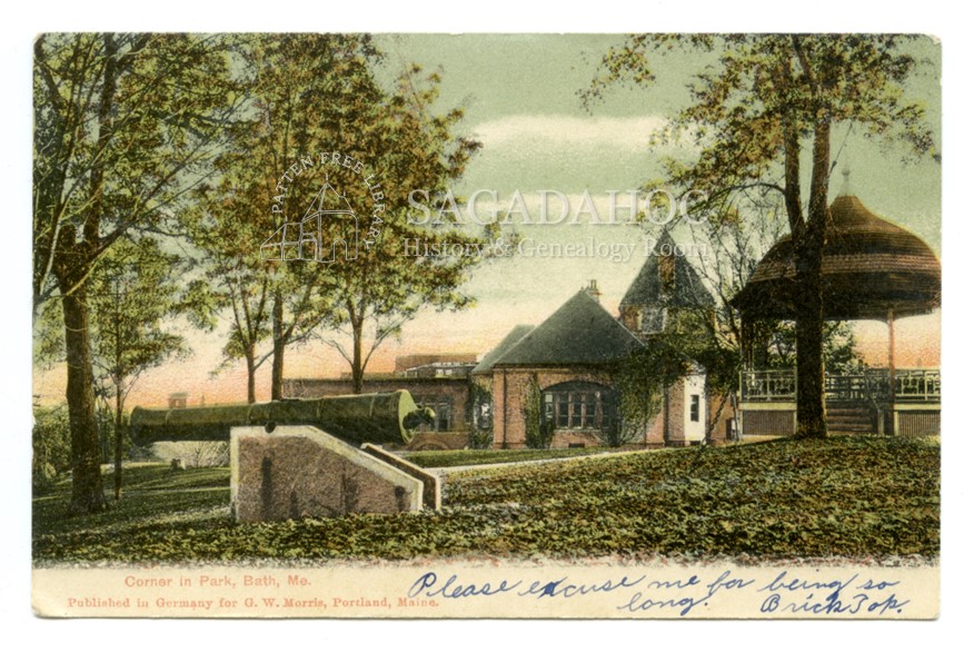 This postcard is part of the Oscar R. Marsh Postcard Collection in the Sagadahoc History & Genealogy Room at Patten Free Library. You can see a different version of this postcard, with more information about the history of the bandstand and cannon, on Maine Memory Network.